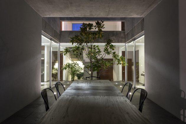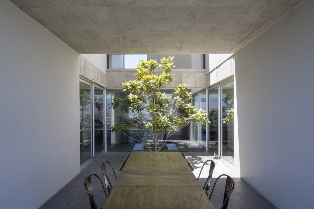 Built on a 305 square meter site, the spatial distribution is organized around a nine square grid. The central quadrant is a courtyard that serves to illuminate and ventilate the rest of the program.