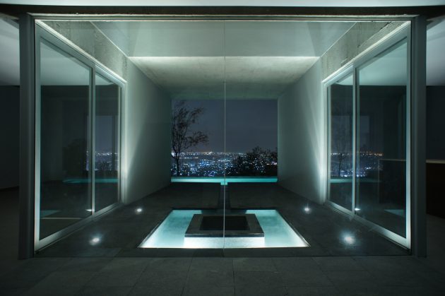 “A reflecting pond, the center of the house with a tree in the middle, anchors the courtyard, with water circulating through a channel that ends in the pool. With an amazing view of the cityscape, the pool blurs the limit between the house and the hill.
