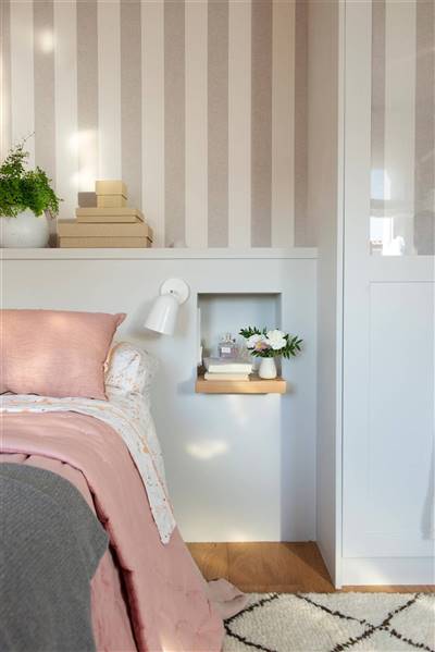 Solid and light at the same time. So is this headboard designed made of wood, it occupies just under 20 cm and is super practical, because its top serves as a shelf and its structure has been used to incorporate the tables, as a niche, so they are not an obstacle.