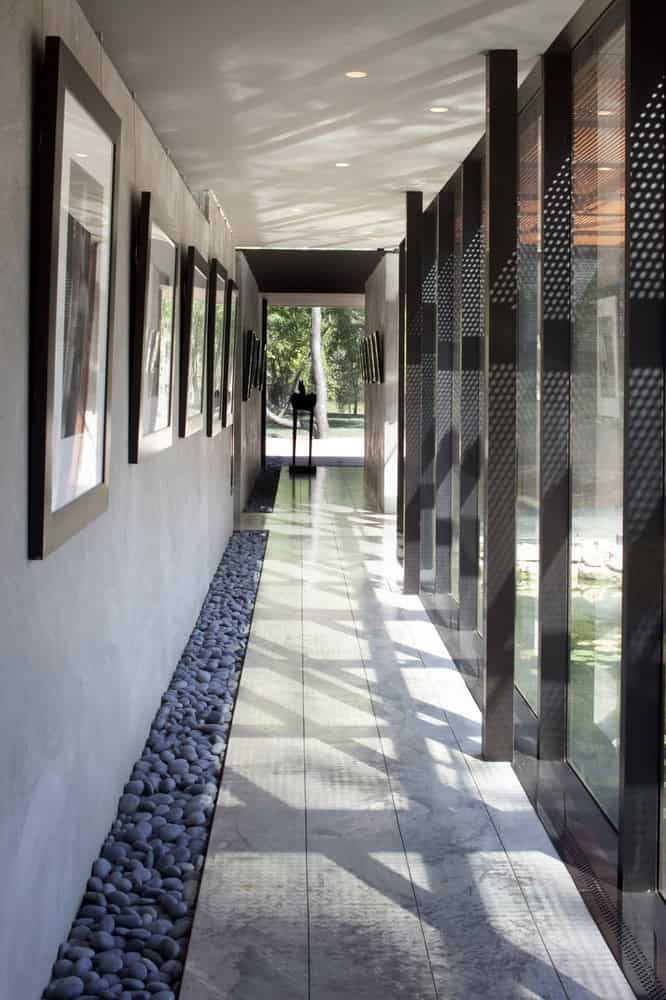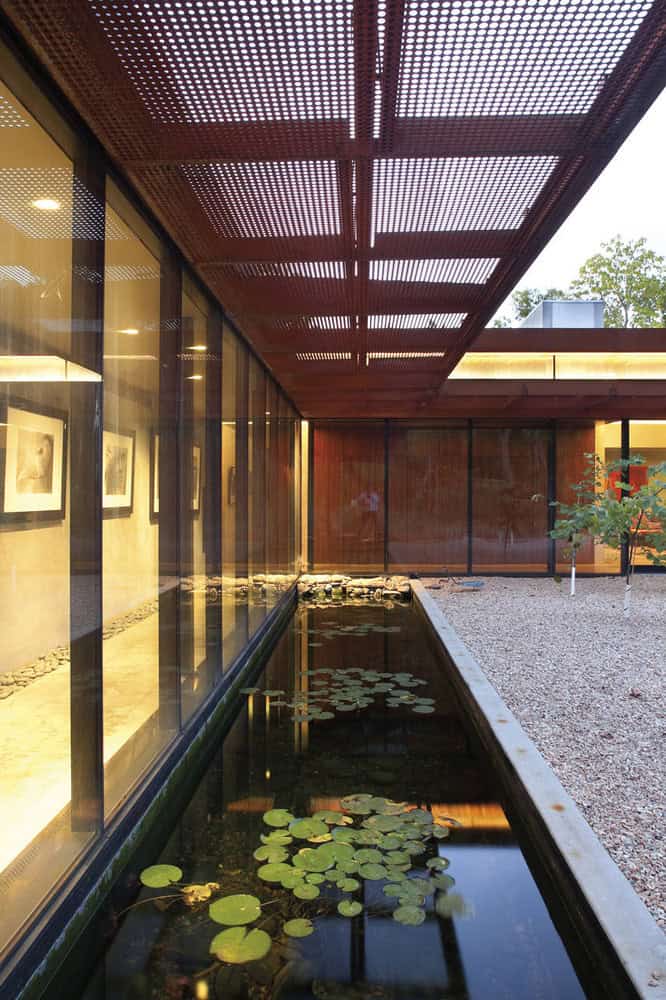 This central space is flanked by two wings containing guest bedrooms and the master suite, respectively, which act to define the edges of the private courtyard retreat, while a large photo studio anchors the transition between the three main spaces, completing the L-shaped plan. The lightness of Heavy Metal’s perforated exterior steel skin in conjunction with the monolithic concrete walls, exposed structural steel, warm rich walnut, and large expanses of glass give the home a distinctively classic modernist character.