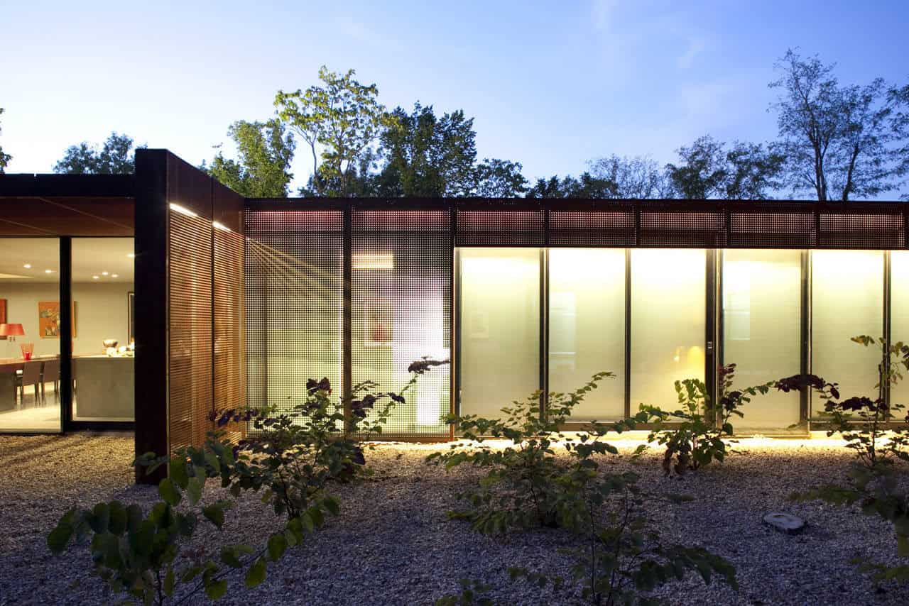Heavy Metal draws its name, and it’s straight forward industrial aesthetic, from the custom perforated steel panels which form the envelope of the residence. Numbering more than 200 in all, each panel has a unique set of perforations based on a simple set of programmatic responses to interior and exterior conditions, which are scrutinized to determine where privacy (opacity) is most critical and where openness (transparency) is desired.