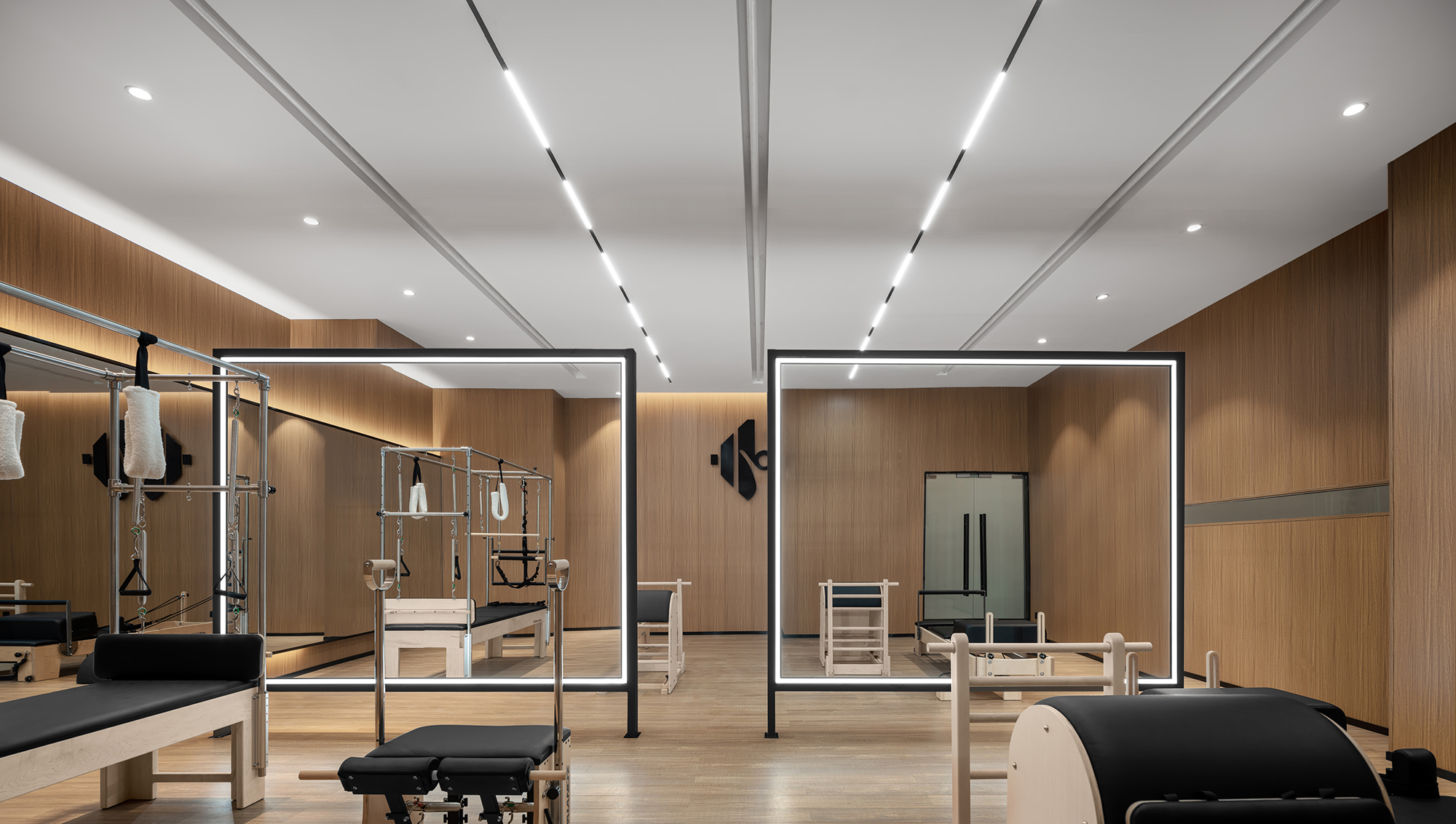 Enclosed by high-transparency glass, the Pilates classroom has a natural wood floor and wood-colored walls, creating a friendly, warm, and comfortable atmosphere. The space is as simple, calm, and amiable as Pilates exercise.