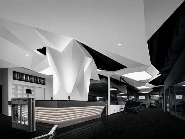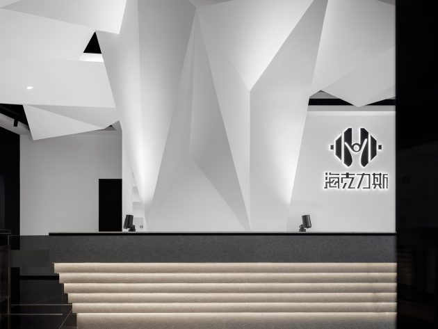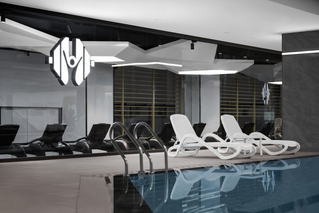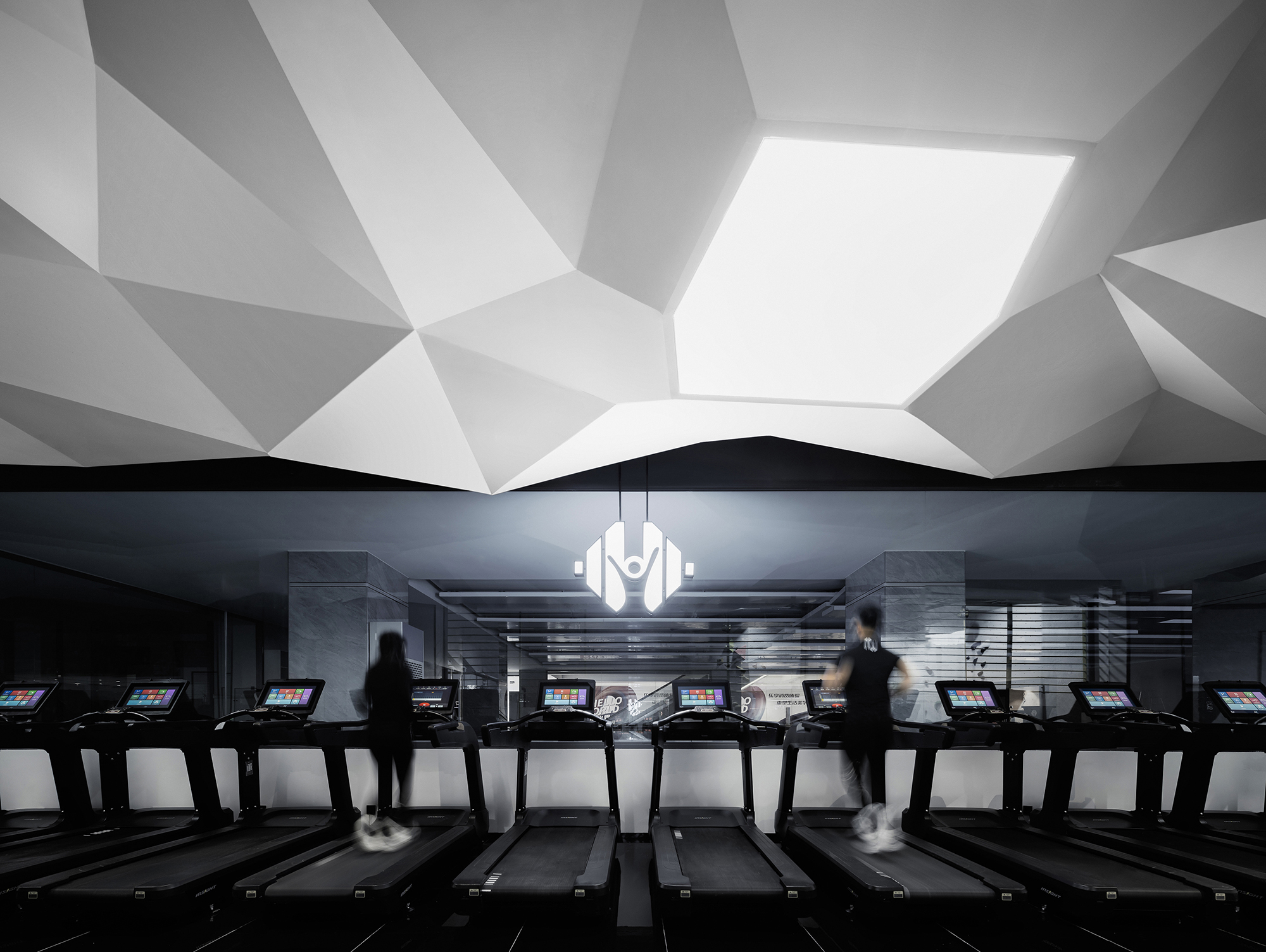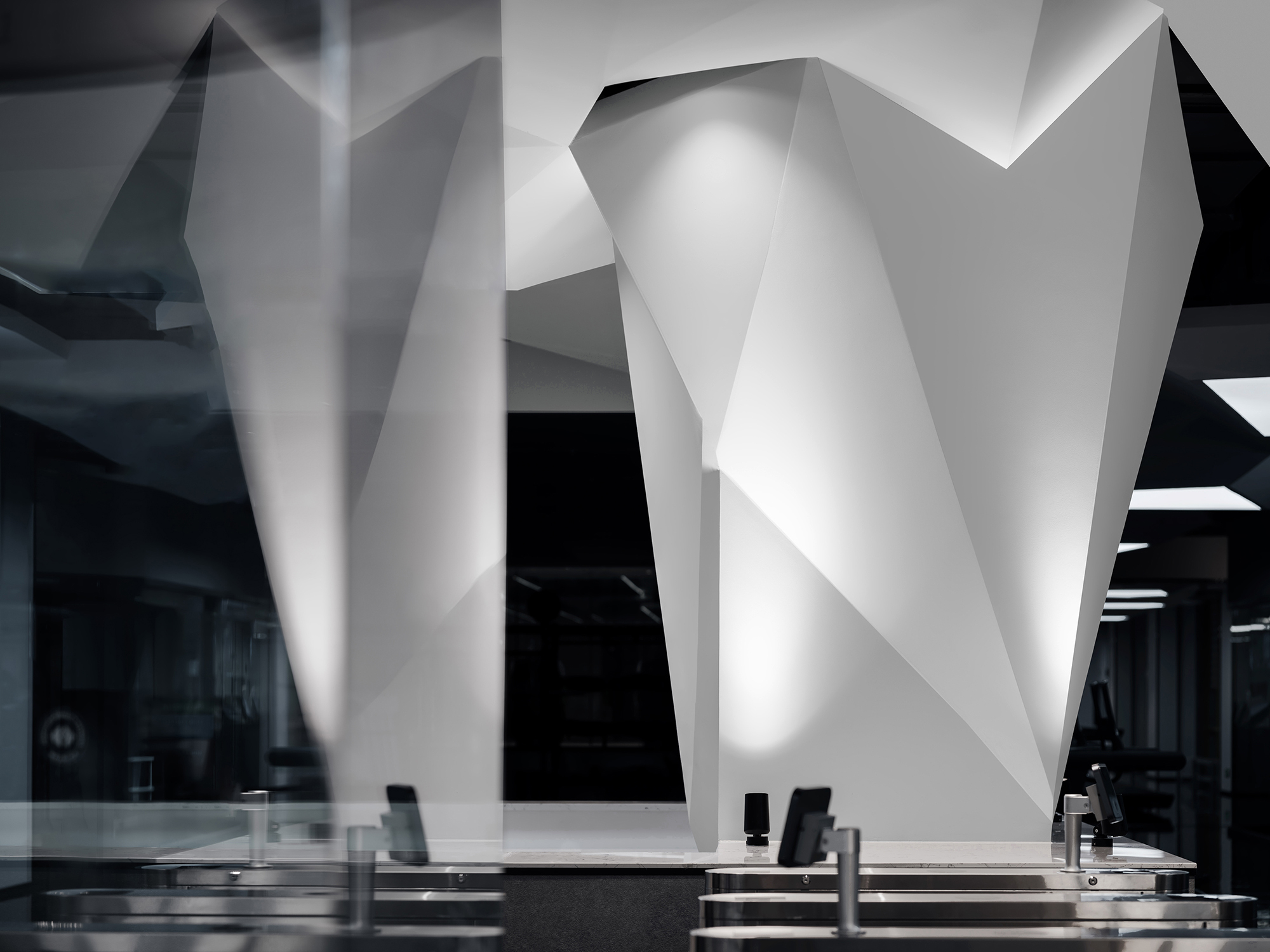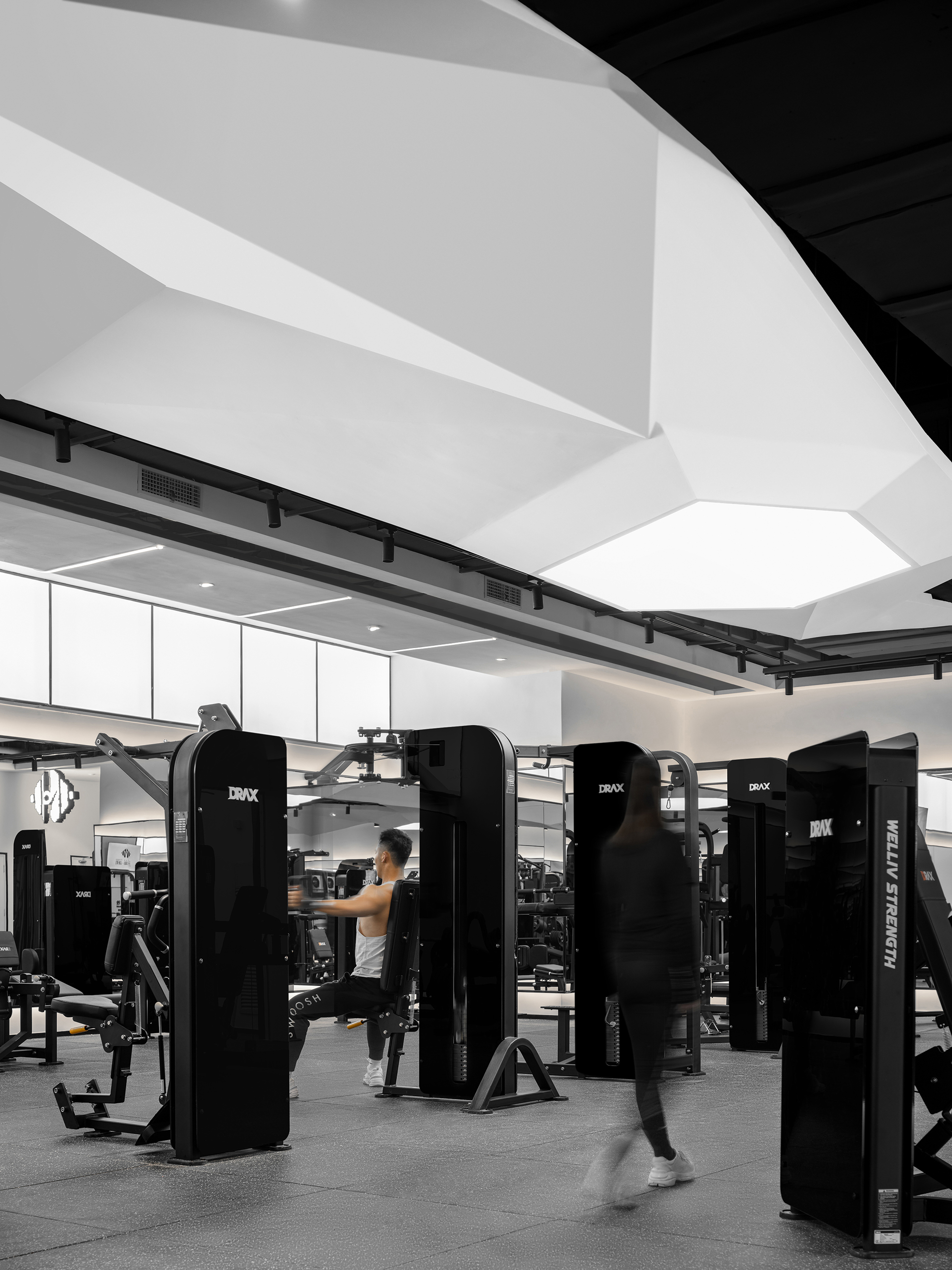 The 4,500-square-meter area serves as Pilates classroom, countercurrent swimming pool, free strength area, rest area, and multi-functional training room. Among them, the design highlight is the front desk and the ceiling of the free strength area where the geometric blocks made of profiled steel plates with a strong sense of shape transform the power and speed of sports into a concrete design language, creating a sports scene with great visual impact and spiritual power. The ceiling lamp built into the pure white blocks solves the problem of lighting.