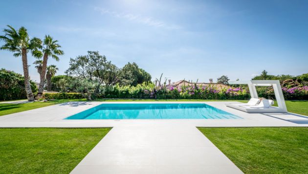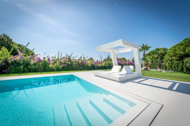 The living areas open fully toward the garden and infinity pool, erasing the boundary between interior and exterior. The covered veranda transforms into a chill-out lounge, equipped with LED mood lighting.