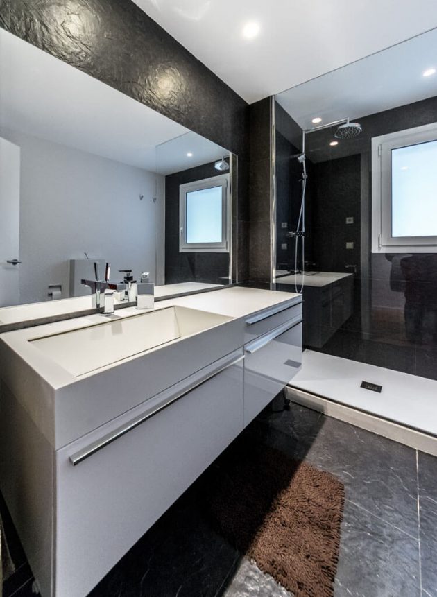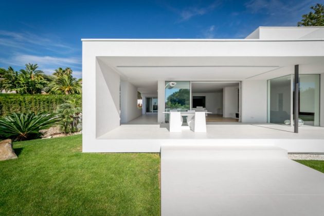 Externally, the home is defined by stacked white rectangular volumes, with large glazed openings ensuring natural light and panoramic views.