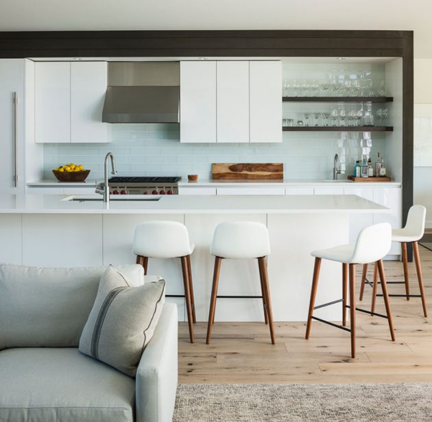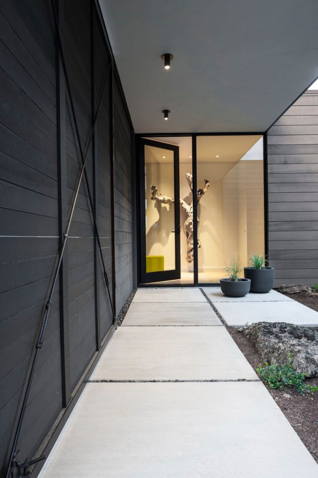 To make it fit with the natural surroundings, the exterior of the house is clad in custom stained cedar siding complemented with large glass surfaces which shower the interior with sunlight but also paint beautiful vistas of the environment.