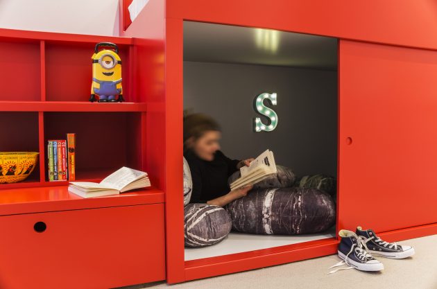 Bedroom was 3 designed to provide a “cool” bedroom – with a secret space to chat / hang out with friends. We designed a bespoke joinery unit which when opened contained a chest of drawers upon which we created an upholstered seating area.