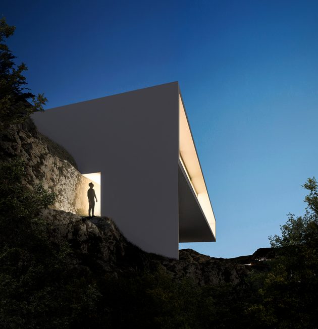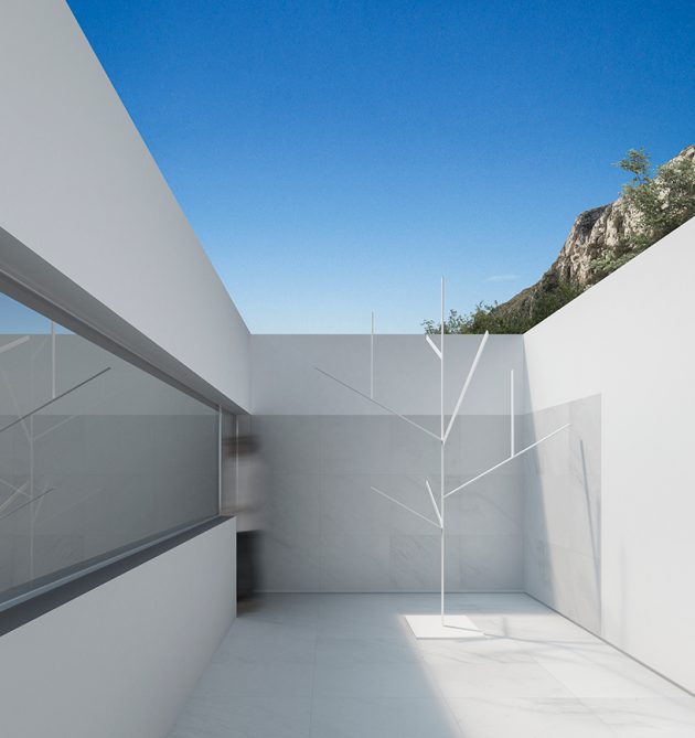 That two levels, access and terrace, are materialized with a grey stone that mimics with surroundings and entangles the volume that contains the home built on white plaster.