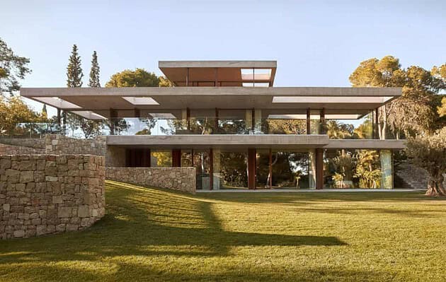 Sleek modern house with expansive glass windows and concrete balconies set in a lush green landscape.