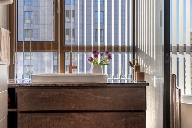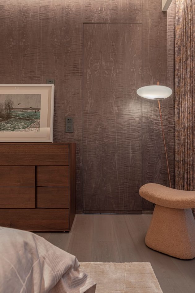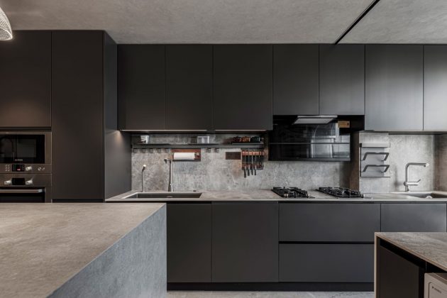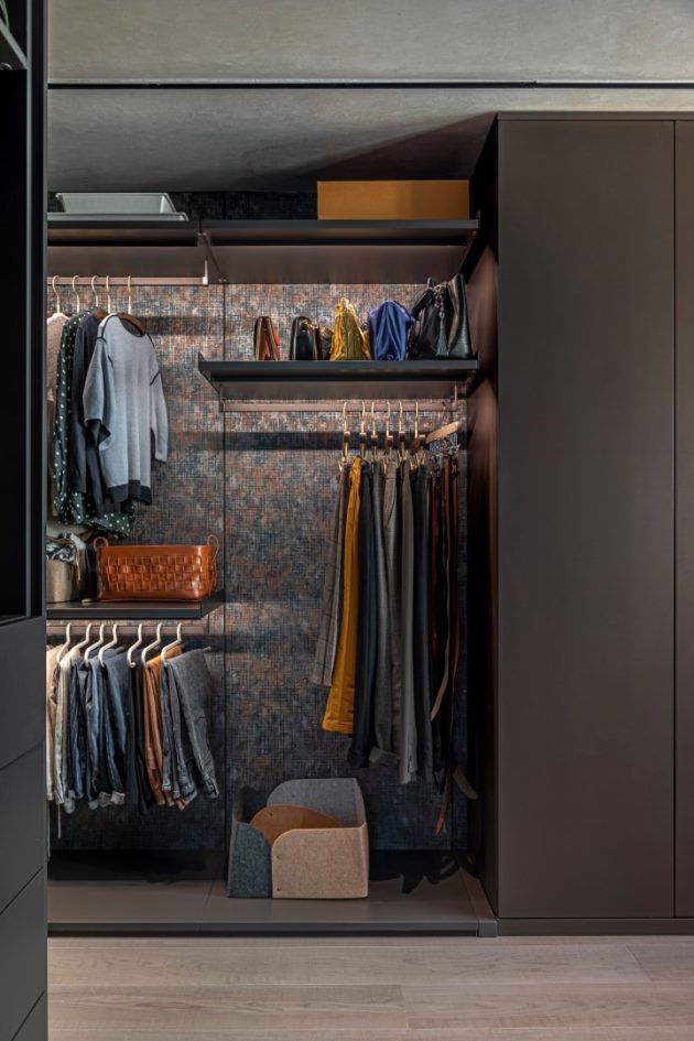 The wall cabinets feature matte surfaces toned between black and mahogany. Their noble disposition creates an inclusive atmosphere for different elements. On top of this, the designer changed the proportional relationship and distribution of the door panels several times to achieve the perfect balance between aesthetics and functionality.