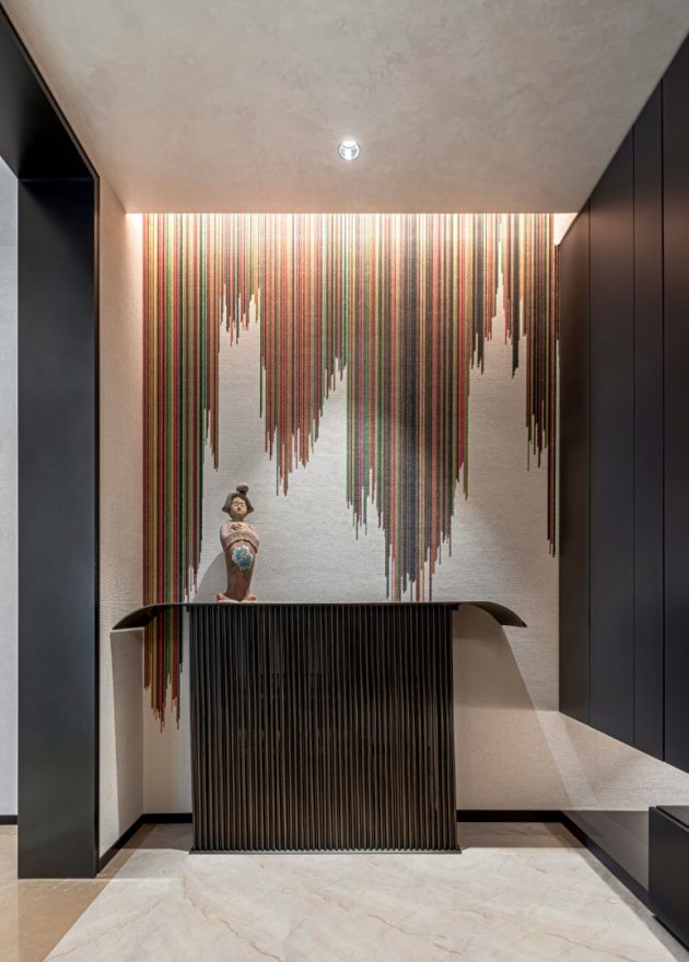 Elegant background walls act as the perfect complement. The inspiration comes from the weave and texture of fabrics drying out in the sun. The notion of traditional craftsmanship adds a romantic touch to the scene. The harmonic aesthetic and connotation of the surroundings enrich all the artworks inside the residence.