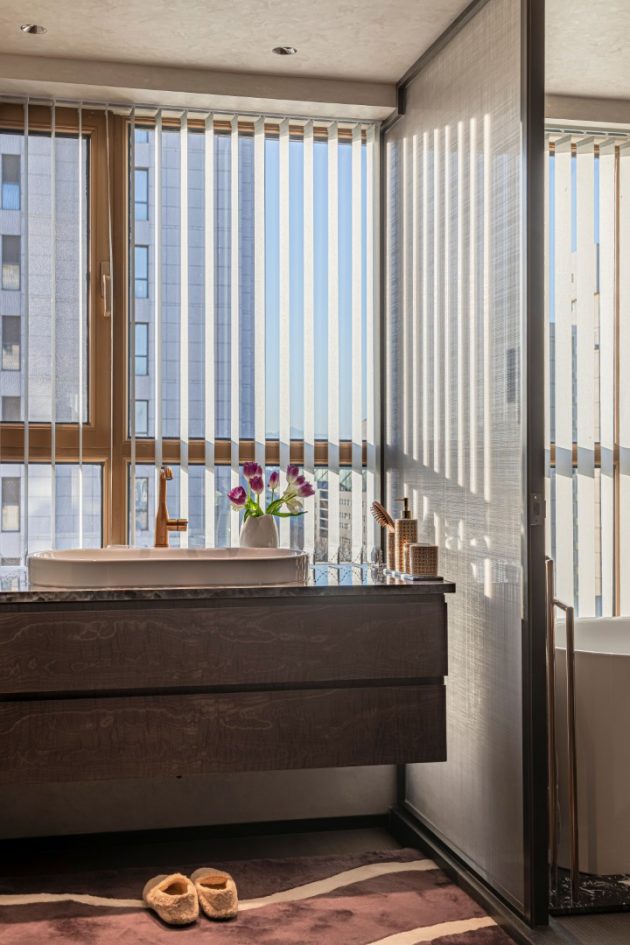Into the residence, the walls become a quintessential design element. Rather than functioning as a standard background, their rugged textures evoke bohemian freedom that celebrates diversity. The design language invites residents to define their lifestyles instead of following prescribed ones.
