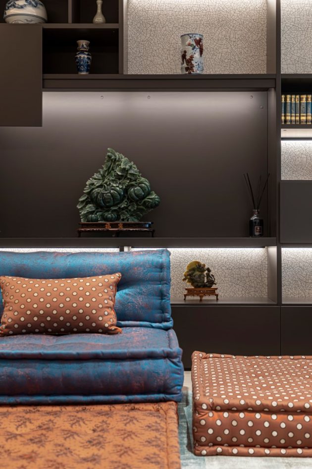 The elegant waistline of the cabinets on the aisle that leads from the living room to the bedroom required a long time to complete. Delicate fabrics were attached manually by several workers to create a silky, smooth finish. The designer applied colors from the Tang Dynasty like crimson red and bamboo green into the piece to permeate culture into the daily life of residents, adding a soft sensorial element that evokes memories of home.