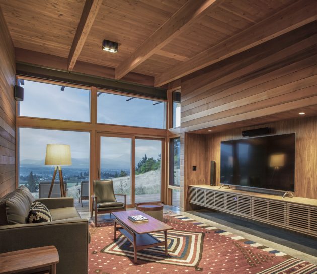 The design’s ambition is clear: to craft a dwelling that feels embedded in place, commanding clear views of Mount Adams to the north while sheltering from prevailing winds and weather from the south. A prominent concrete wall runs the length of the house, grounding the structure into the site and providing a protective anchor for the volumes that open northward.