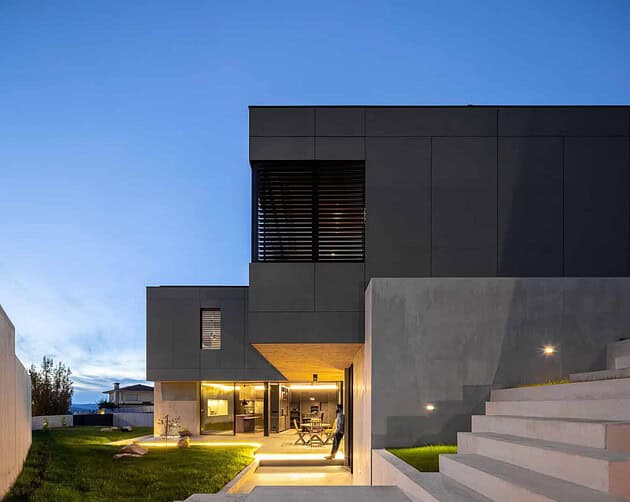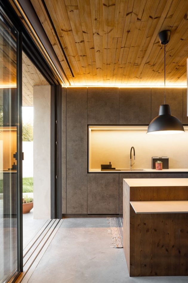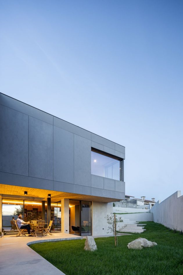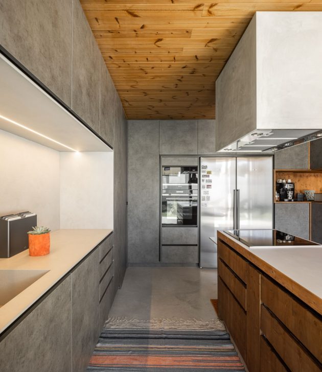 The couple who owns the house had a clear intention about the social atmospheres. For them, everyone should be visible and part of the family, no matter if cooking, reading, or working from home. On the other hand, they wanted to be comfortable at night without feeling uneased by shadows and exterior movements. The normal division between social and private spaces became clearer than usual, thanks to these constraints.