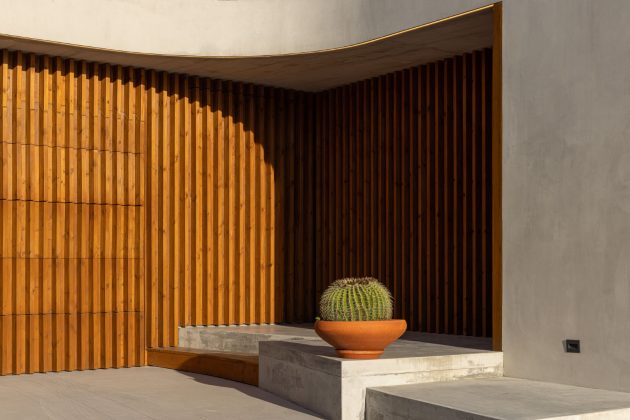 This was the narrative that started building the mental walk-through gluing all the interior spaces. When arriving at the door, the guests still don’t understand how the interior spaces are created, since the volumes don’t let you look inside, so you will need to find your way in. Once the main door is opened, as you enter the gray hall, there is an expectancy about what it going to be seen next. The first rays of natural light are an invitation to the living room. The next steps reveal a high ceiling, which connects the upper floor through suspended stairs using the same wood as seen in the exterior of the house, and all the social and working atmospheres, including the exterior garden.