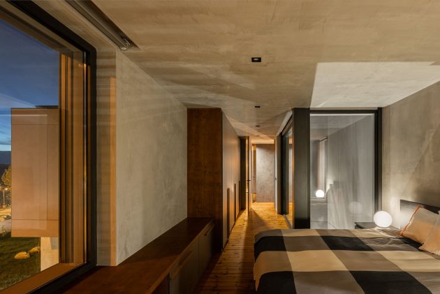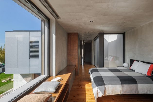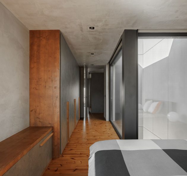 The master bedroom has a direct connection with the vertical winter garden, which reflects the light from the below level into the first level and vice-versa. If there is moonlight it will enter through this glass and invade the room, illuminating the room. A bigger window is placed in the corner of the bedroom, creating a particularly interesting moment when the natural rays almost become parallel to the ceiling and floor, shifting the wall from gray to almost white.