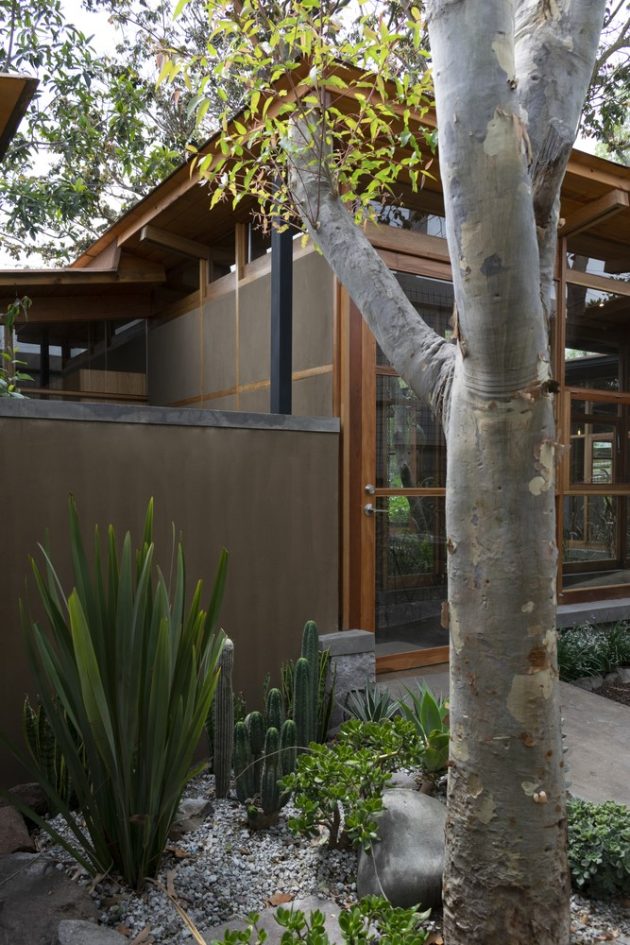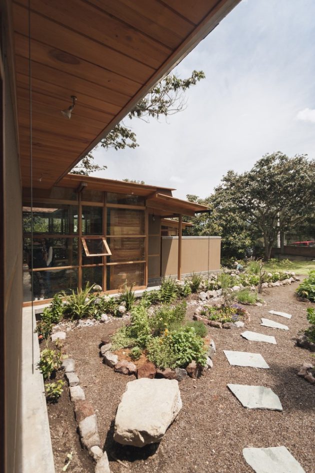 Natural light shapes the character of the house throughout the day. Morning light filters through the trees into the eastern rooms, while soft afternoon light glows through western glass walls. The roof overhangs and deep eaves create gentle shadows that cool the spaces and add visual depth.