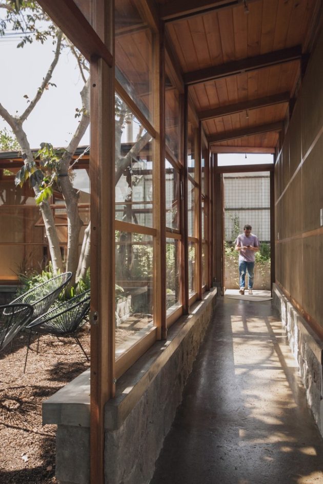 • Transition areas — covered decks, open corridors, and bridges that flow between interior and exterior space.