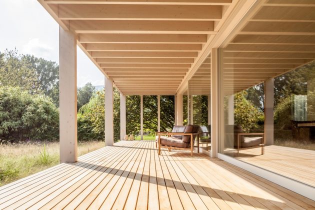 Situated in the shore zone of Lake Biel amidst lush vegetation, wild willows and natural meadows the house keeps strong spatial connection to the surrounding nature. Therefore the interior spaces get extended by a large porch on the ground floor and two terraces on the first floor. Porch and terraces generate in between spaces where the clients can experience the play of nature, the change of the seasons and the twittering of birds but still be protected and feel safe. Large windows connect inside and outside. The sunlight enters the interior spaces through a filter of timber lamellas framing the outside of the porch.