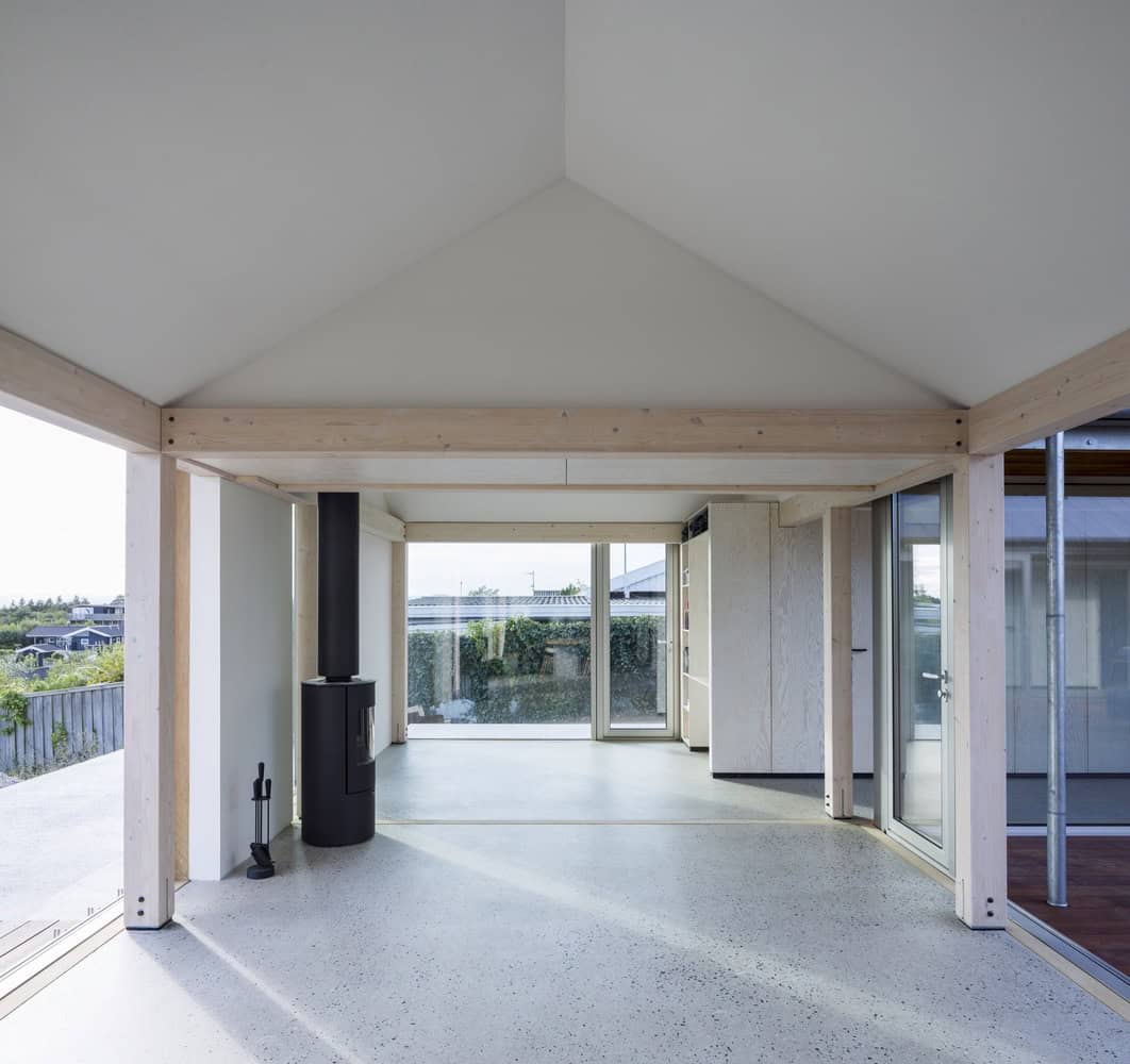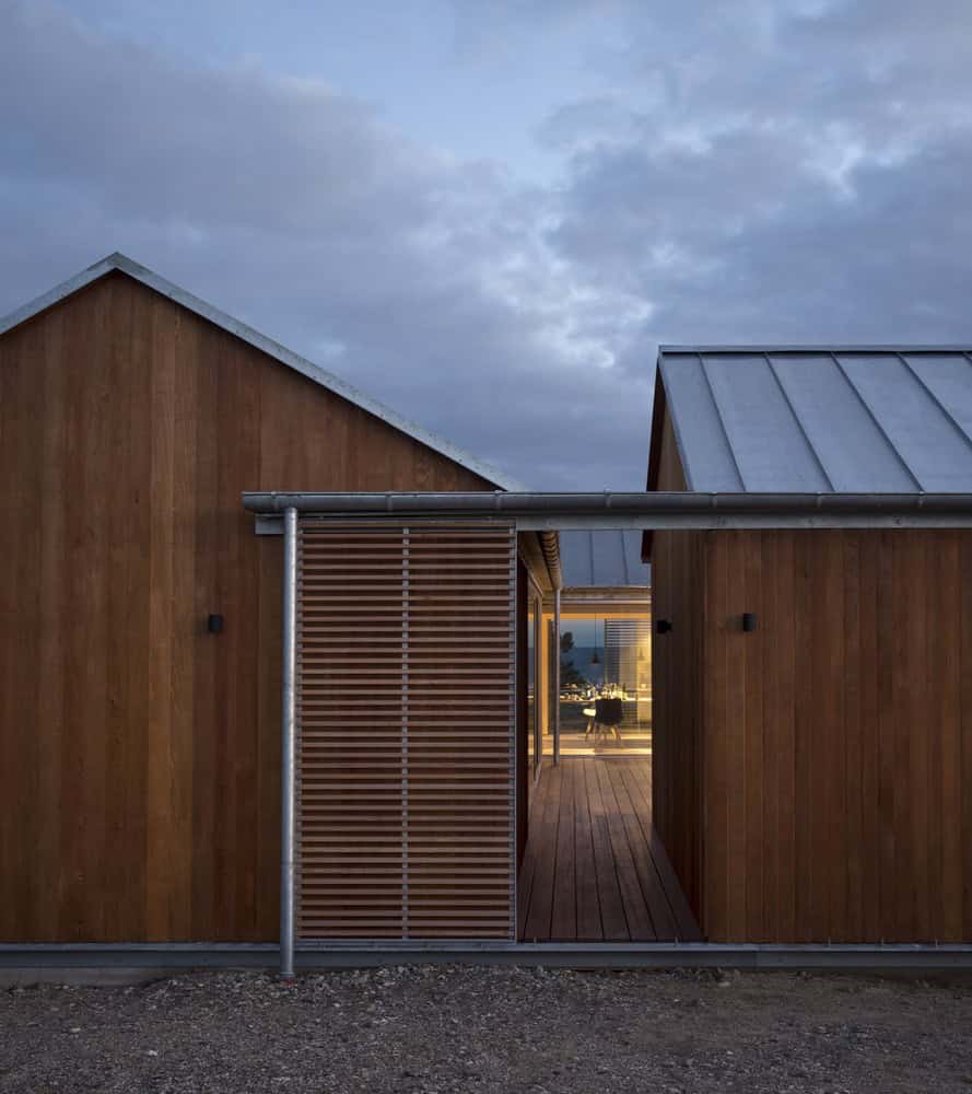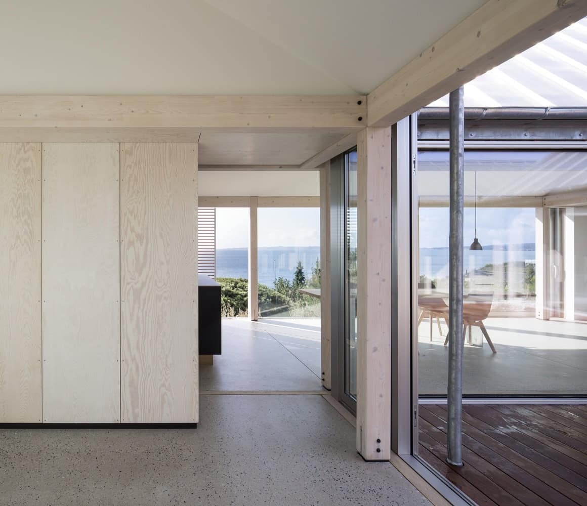 A rugged outer materiality consisting of wooden planks, galvanized steel and zinc makes for a house that can withstand the harsh costal climate. A polished concrete floor with exposed aggregate provides a robust surface to handle the indoor/outdoor use of the house and the walls of pinewood sheets lends warmth to the interior.