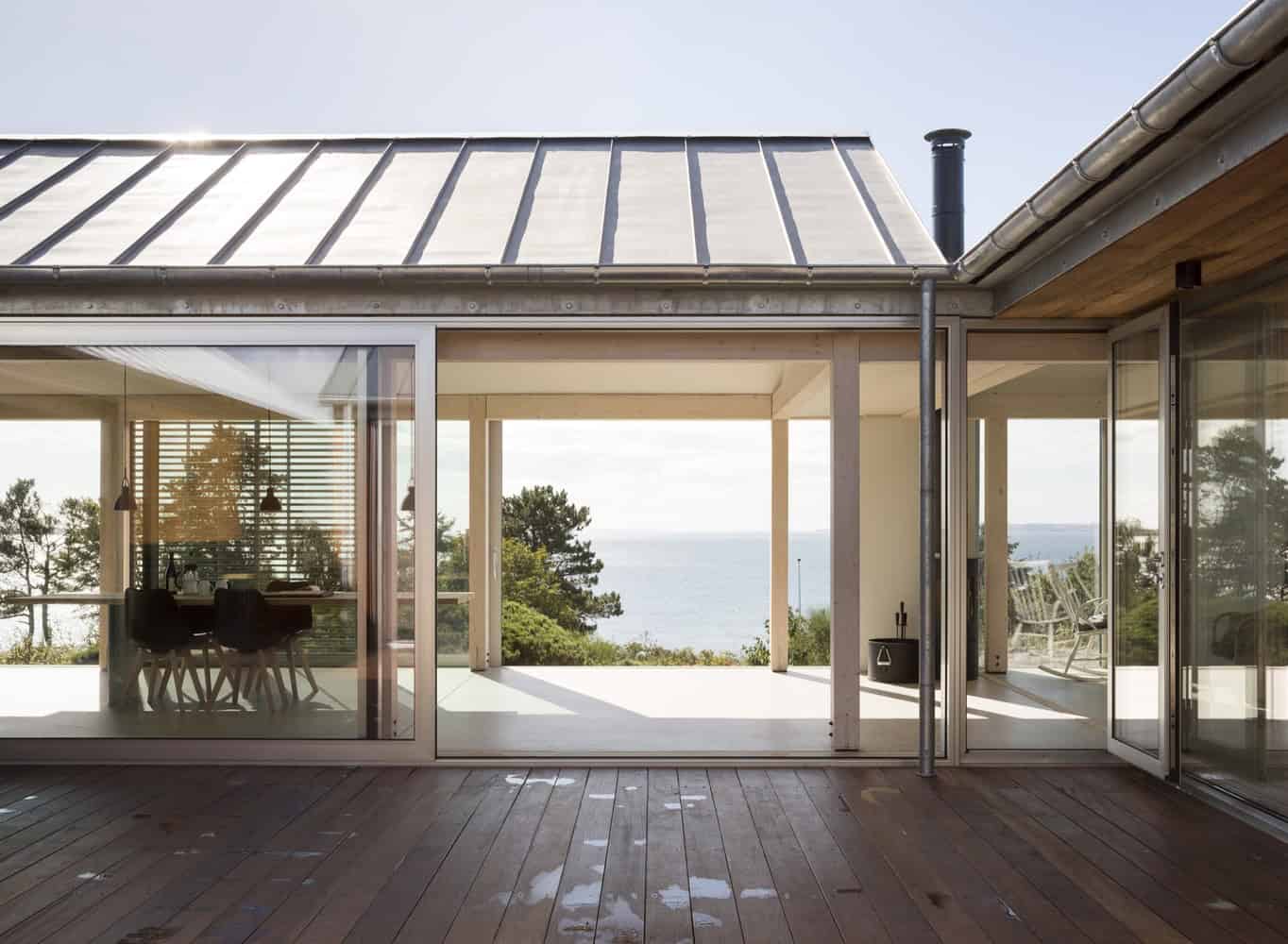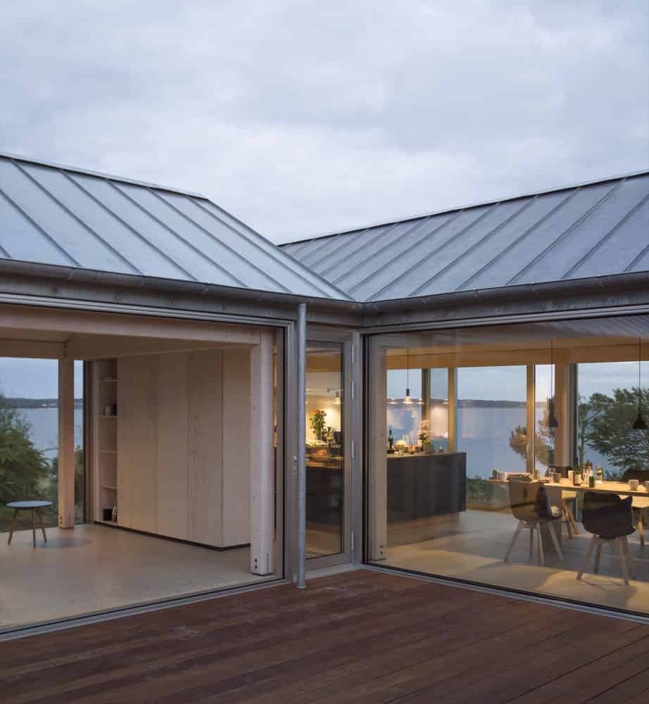 From the architects: “Four small houses enclosing a central courtyard is the basic frame like structure for this summer residence by the shore of mainland Denmark. The exterior of the house is modest- even slightly introverted – but entering the courtyard reveals a spatially open house with a warm pinewood interior. Glass doors and sliding partitions ensures visual contact between rooms across the courtyard and also provides a clear and unhindered view over the bay.