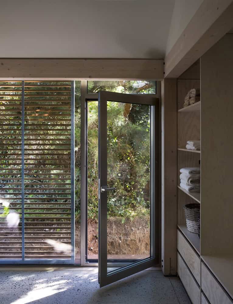 From the architects: “The courtyard provides shelter from the heavy costal winds. Shutters, sliding doors, and curtains can be manually moved around to create different flexible spaces and graduate the openness of the house. Glass surrounds the inner courtyard which creates a continuous interior space with the more private spaces situated as closed boxes around the courtyards periphery. in each room there is a private exit leading to an intimate outdoor area shielded by the surrounding bushes and trees.