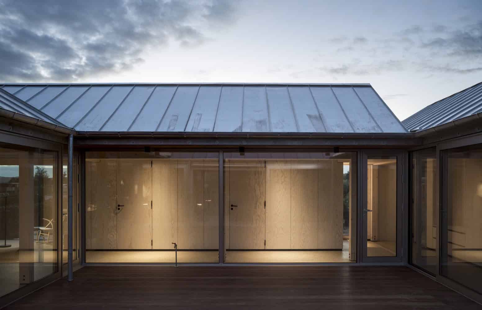 From the architects: “All the houses are connected in a mainly open plan structure while the differently pitched roofs emphasizes a variety of heterogeneous spaces. Various possibilities of connecting the rooms across the central outdoor space in the middle make for a multi functional house that provides a second home for the two owners both in private and when they are joined by their big family.”