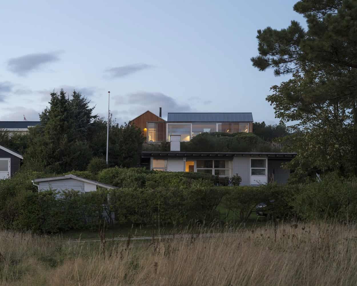 Sitting high above the bay and the distant city of Ebeltoft on mainland Denmark, the House at Mols Hills is built as a summer residence by Lenschow & Pihlmann. The unique residence is made of four mini houses that enclose a central courtyard. Each of these are independent but connected and serve a variety of functions. There is an entrance area with a water closet and showers, quest quarters, a living room, a dining room, a kitchen and a master bedroom.