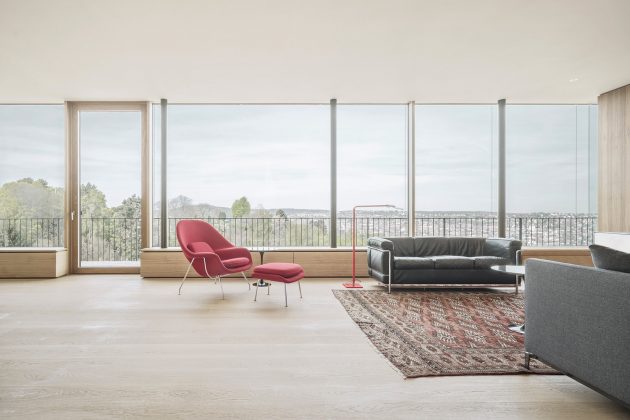 To this end, the building’s roof and ground floor were partly removed and rebuilt in wood. The new construction has an airy, spacious quality, and provides an elevator and a generous roof terrace. Panoramic windows at the newly designed levels afford unimpeded views over Stuttgart and the nearby Teahouse. The building’s open interior has a continuous flow accented by unique architectural spaces, built-in furniture made from oiled walnut and oak and carefully positioned windows. Living in “green space,” above the rooftops of the city, is thus experienced spatially through one’s ever-changing point of view. The ground floor and the upper floor are connected to each other by an open staircase flanked by wooden built-ins.