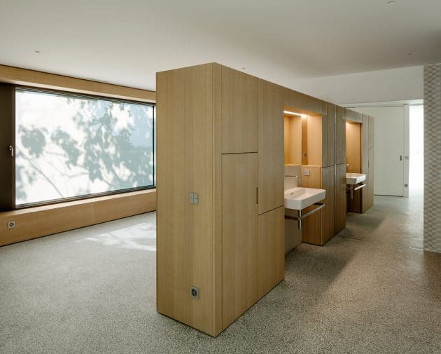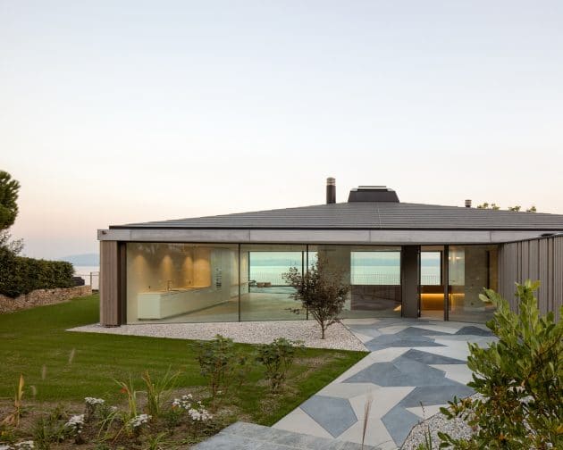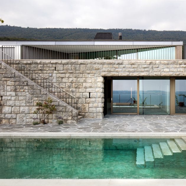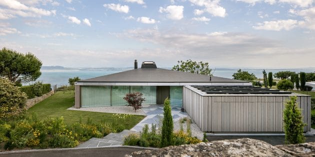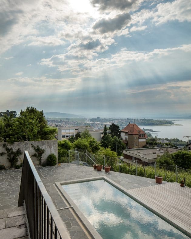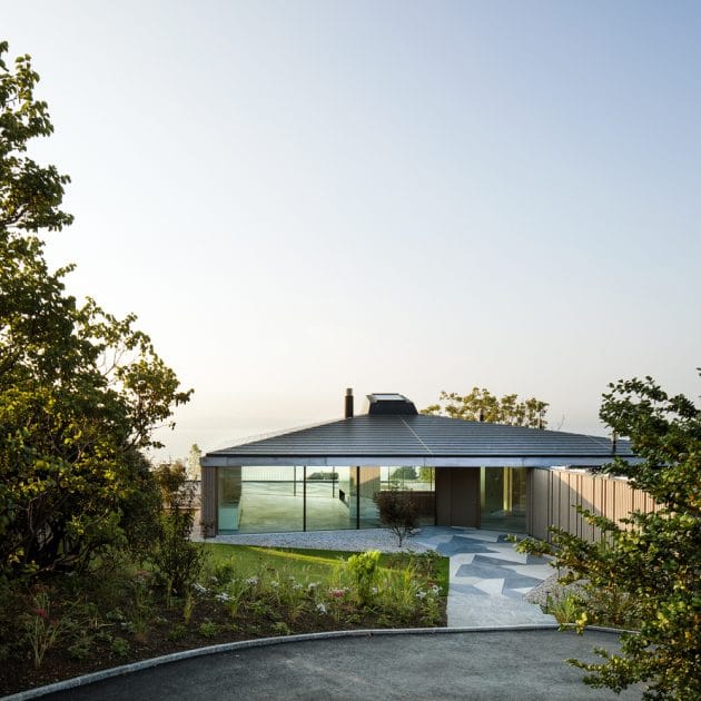 The new construction on the upper level takes exactly the outer perimeter of the demolished volume. A single- storey wooden volume with a pure four-sided roof forms the living space that opens onto the lake from the south through large bay windows and onto the rear garden with views of the Jura mountains. Glass facades folding inwards create on the north side the entrance and on the south side a covered terrace with panoramic views.