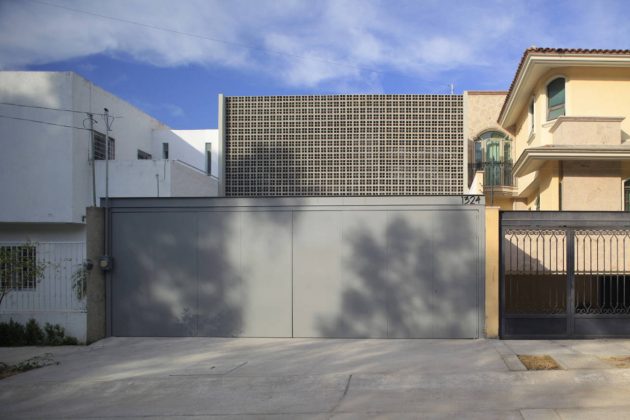Modern residential façade featuring a unique concrete block wall design for ventilation and aesthetics, complemented by a wooden gate and contemporary urban architecture.