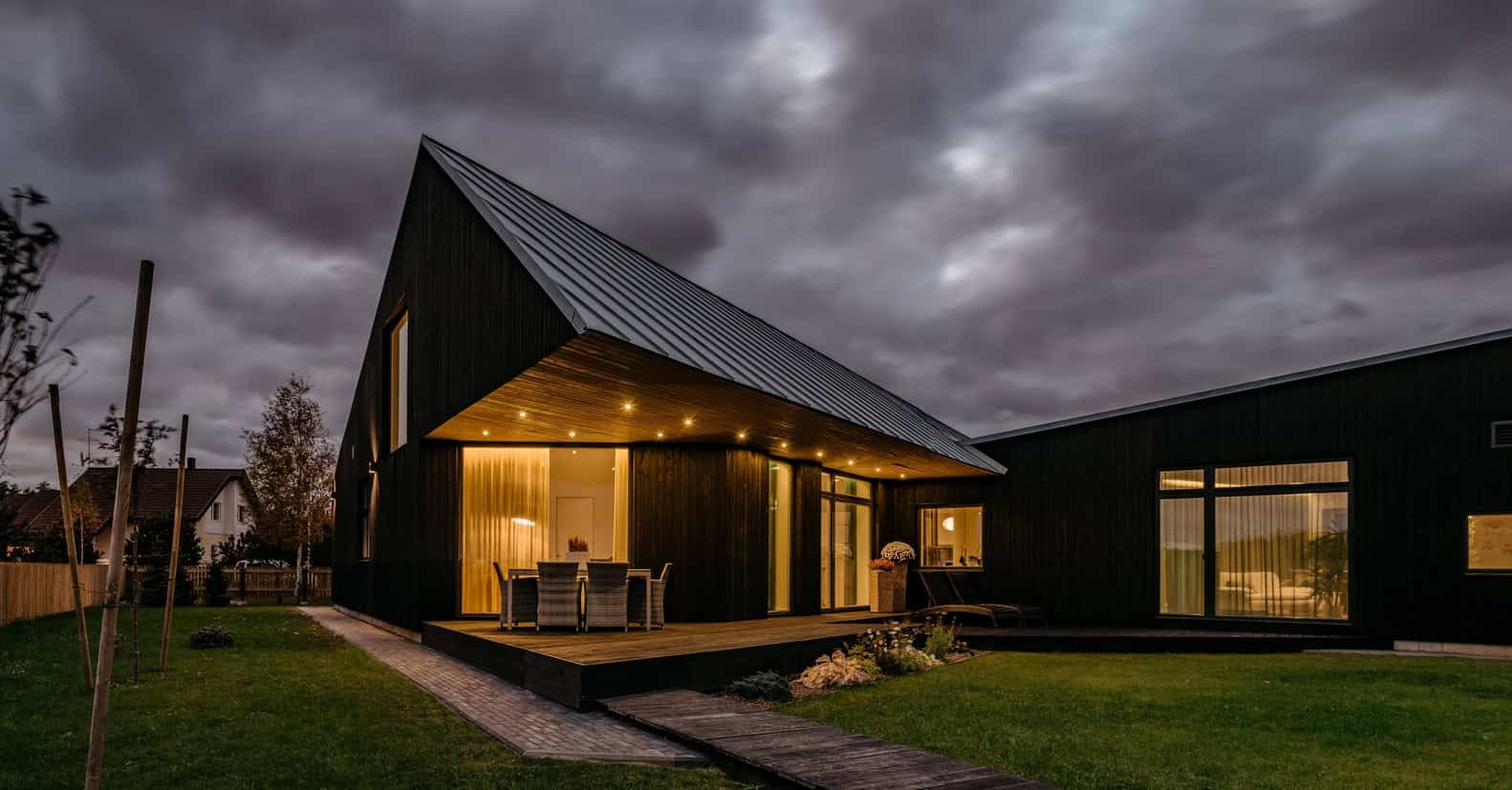 Contemporary modern house featuring sleek black exterior, wooden accents, and large glass windows, illuminated warmly at dusk, showcasing innovative architecture and stylish design.