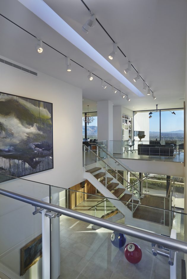 “The inclusion of gallery space and its appropriate protective measures overlaid the architectural program. Miesian glass walls were replaced with a studied array of spotless shadow boxes protecting deeply recessed glass panes. The clients shared their inspiration and enthusiasm for Renzo Piano’s Atrium in the Modern Wing of the Art Institute of Chicago. The interior stair acts as a tectonic centerpiece, contrasting the formal execution of the main atrium while matching its clarity and refinement in detailing. This Atrium houses the bulk of the owners’ art collection and connects the upper and lower floors of the residence. The height allows the living spaces to breathe and provides a new appreciation of the various pieces of art as they are viewed from different positions in the house. A single continuous skylight centered down the middle of the gallery marks the passage of time without harming the cherished art held within. The main living and dining spaces face south, framing the view of the desert below in a perfect unobstructed volume.”