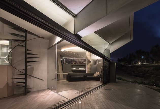 The House in Sikamino by Tense Architecture Network is a one-of-a-kind residence in Greece, characterized by its elongated roof that doubles as a walkable garden. This rhomboid-shaped roof is home to the central living area, while the sleeping quarters are located at the edges. The residence features an underground level to support an agricultural lifestyle, with a concrete exterior and iron frames, blinds, and shutters.