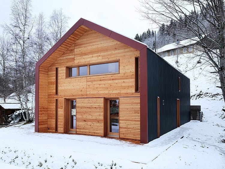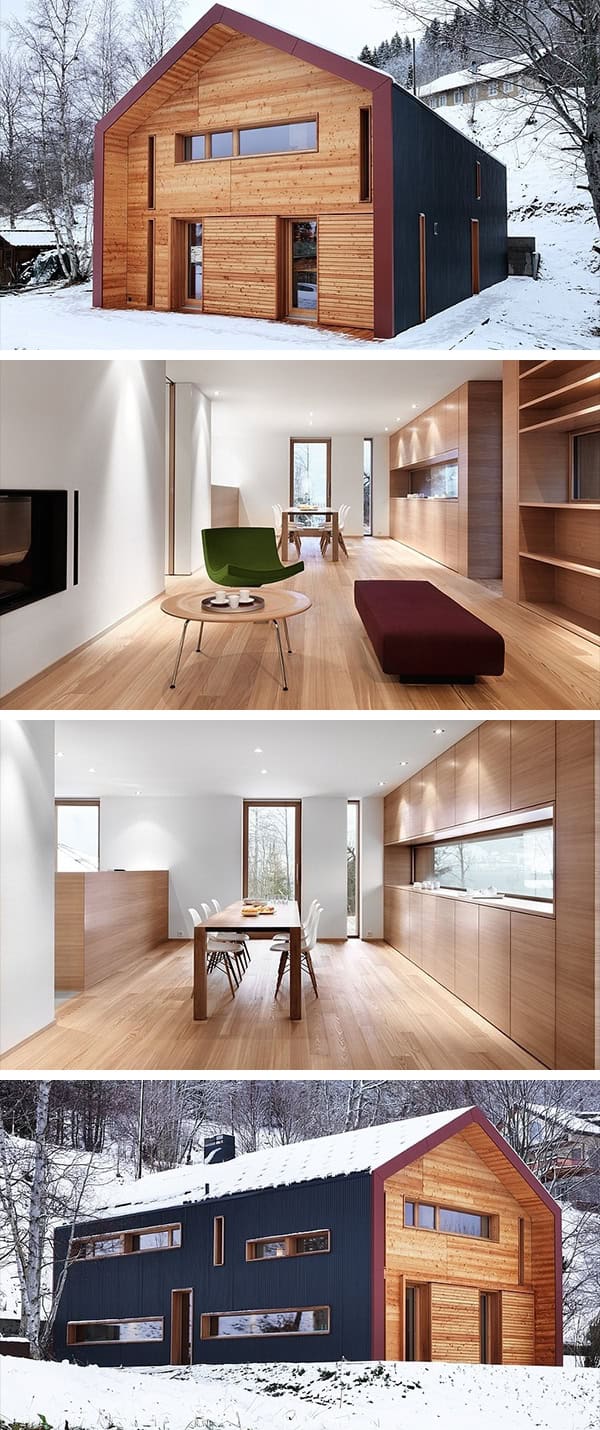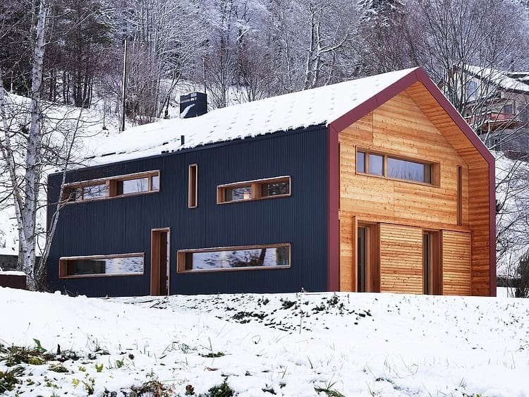 From the architects: “Standing on a plot of 800 square meters, a few steps from the Lake Joux’s shores, an anthracite metallic shell shields the interior life of this house from the famous harsh climate. The vernacular use of this ondulated metal sheet inspired the architect.