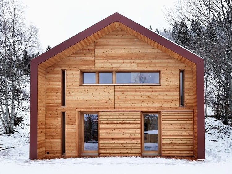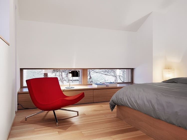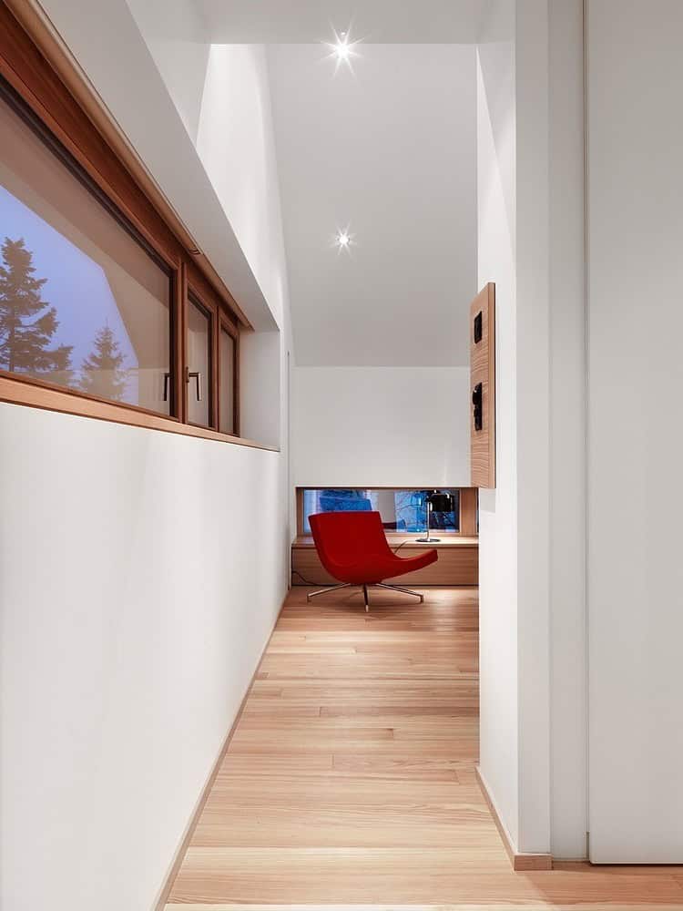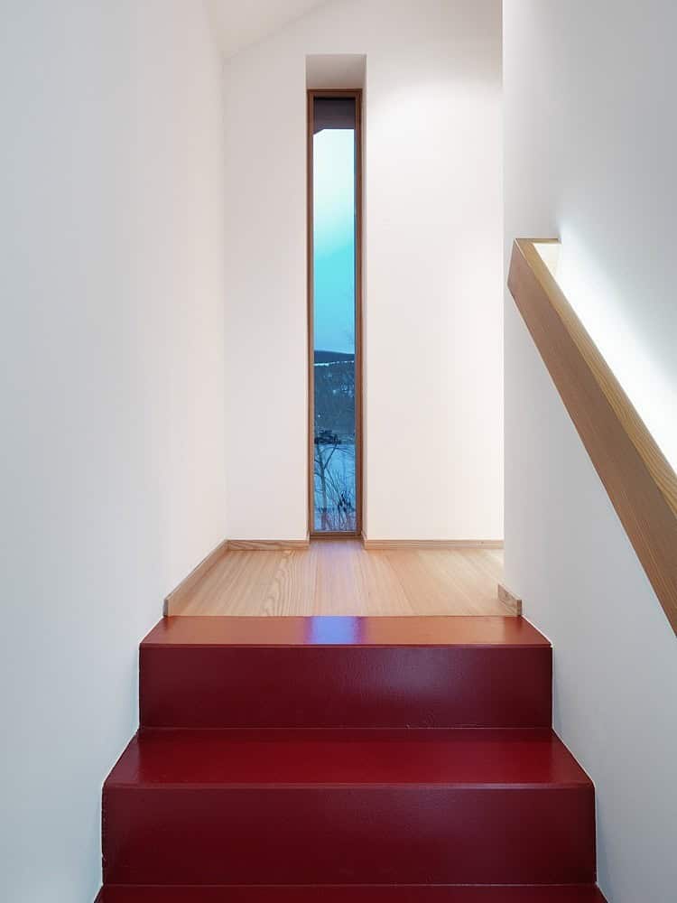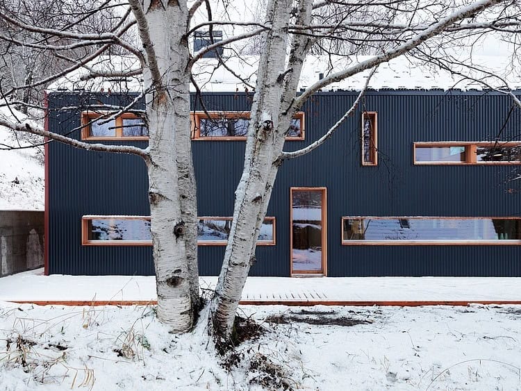 The house itself is protected from the cold climate by a dark, anthracite metallic covering. Each end of the building is set back and covered in larch wood while the windows are long and narrow, letting the homeowners to enjoy the panoramic views of the like as well as detailing the exterior.