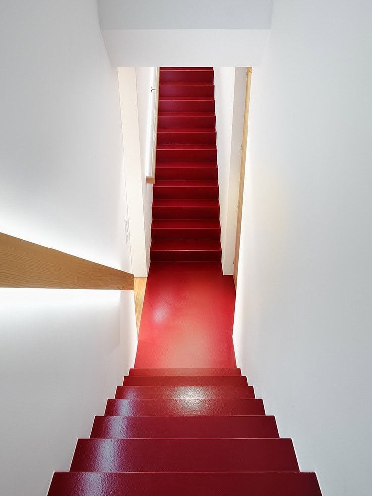 The first floor, accessible by two red lacquered staircases rising on each side of the lobby, is separated into two parts. On one side stands the master bedroom with its bathroom, and on the other side accommodations can be offered to family and guests. These two distinct spaces create a pleasant sense of privacy for anyone staying there.”