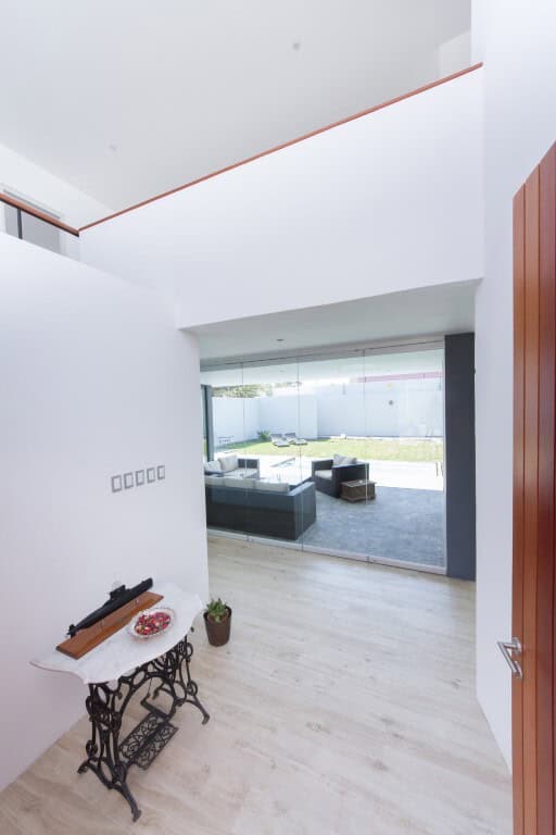 The house juxtaposes the image of a massive volumetric block with interior spaces that are more open and luminous. Together, they create increased privacy, maintaining and maximizing intimacy for the family and their daily activities. This effect is best noticed when walking from the courtyard entrance into the vaulted ceiling entranceway.