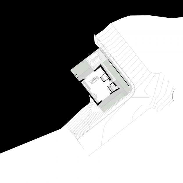 A white volume with its oblique outer boundaries defines the openings of the dwelling on both floors, and where in one corner of the house a glazing is directed towards a privileged view.