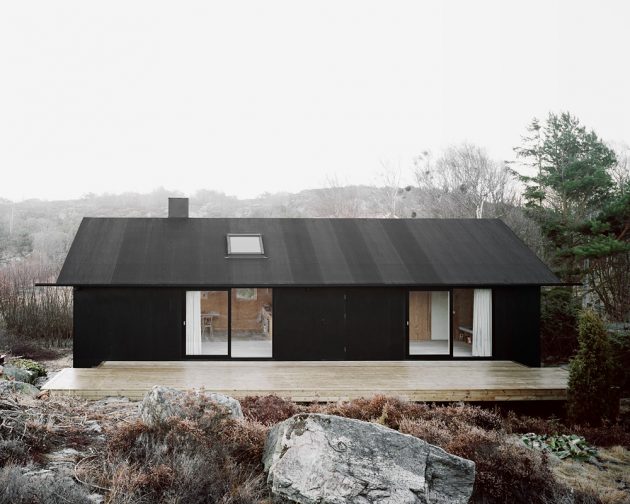 House Morran is located on an island near Gothenburg in Sweden and has been re-clad in tar-coated plywood. The roof, eaves and gutters are also coated in the same color. It is a small home styled in minimalist fashion. The interior is finished in natural pine while most of the structure has been kept intact in order not to exploit the landscape but just to refine and strengthen the qualities that already exist.