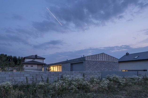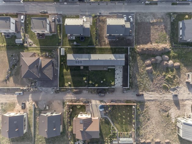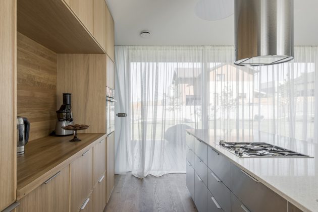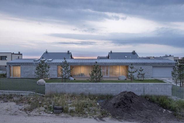Inspired by the beauty and the simplicity of Lithuania’s natural and raw materials, this house exudes peace. It’s a balanced fusion between modernity and purity. The property, located in a neighborhood in Kaunas, was built all the way along the length of a 1200 m2 terrain, creating a 190 m2 longhouse with a private yard, a wide entrance, and a beautiful front garden with natural big stones and pine trees. The space between the limits of the parcel and the beginning of the construction of the house, allows daylight to brighten the structure and the sun rays to maintain a pleasant warm home.
