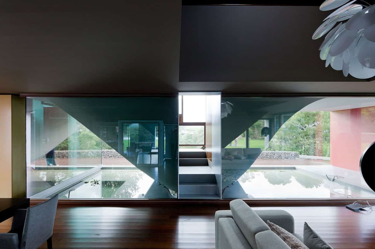 The house is located in the north side of S. Michael Island in the Azores. Since the microclimate of this farmland offers frequent wind and showers, the first design strategy was to block these winds with a wall, and offer diverse patios and covered courtyards to protect against rain. These patios and courtyards also open all living spaces to the natural green by glass walls, which receded from the exterior.