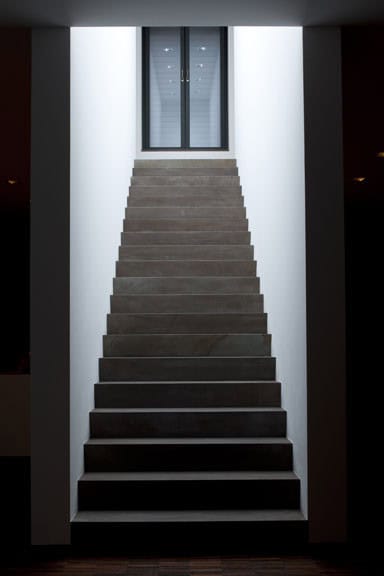 Combining uniform wallwashing with selected accentuation creates hierarchies of perception and provides compelling visual perspectives. This is complemented by selected places for object luminaires that add warm coloured accents. The main lighting object, however, is the staircase positioned as a central core between the living and the dining area; it appears to be self-illuminating. With a height of up to six metres, the room is scenically illuminated using RGBW LED lens wallwashers to utilise the full colour spectrum of light. Simulating the appearance of a skylight during the day, sunlight seems to pour in between the two shear walls at night long after the sun has actually set. Even more spectacular colours than moonlight and ice age atmosphere are possible, of course, the strength of the luminaires, however, lies in their subtle discreetness through the play of cold and warm light throughout the course of the day to further enhance the relaxed atmosphere in the home.