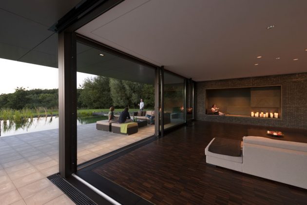 The grounds include terraces for different times of day and seasons and dovetail the building with the property. Large sliding doors remove the separation of interior and exterior, a roofed sitting area outside complements the room plan. A natural pool right outside the living area features oak timber decking.