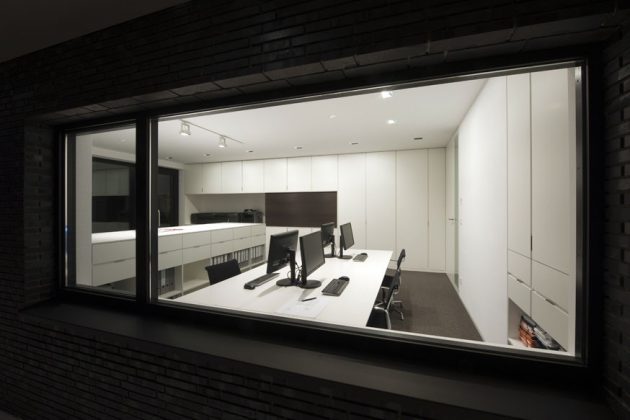 All furniture except for chairs and a table were custom-made specifically for this home. The kitchen section as a folding unit through a small library and on to the office becomes a central defining element.