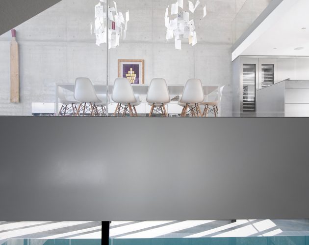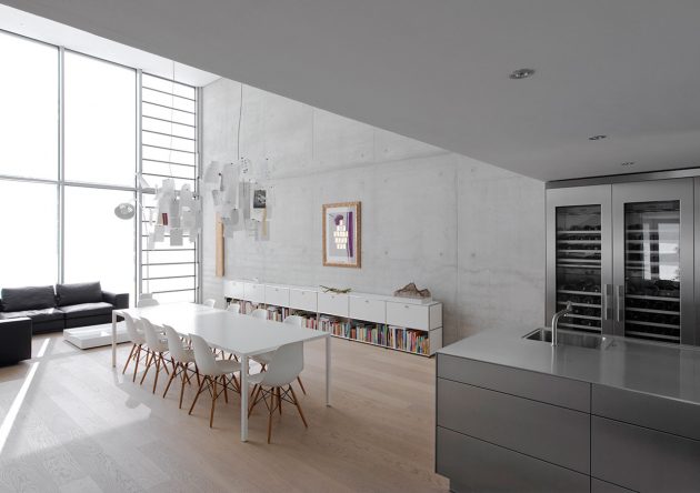 Even though it looks like there are only two floors, this is actually a four story residence where the first floor is actually dug in and the fourth floor is on the roof. All of the levels are connected with two open stairways formed from poured-in-place concrete.