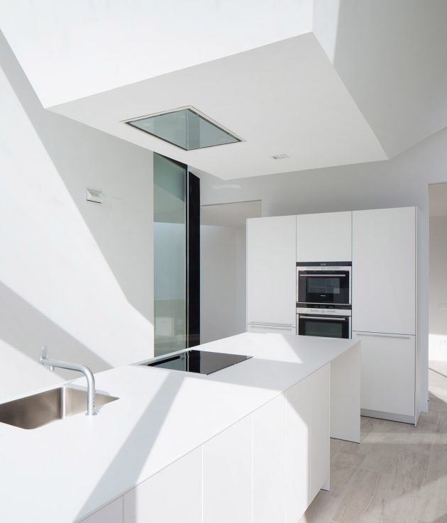 Building geometry is divided into five main bodies or pavilions (1. Entrance stair and craft room, 2. Kitchen, 3.Living room, 4.Suite, 5. Children’s bedroom) separated by patios and all connected by a central distributor that serves the different rooms. This central part is covered by a flat roof; from this central hall,the five spreads are covered with an inclination of 30º (from the center to the exterior – unlike conventional roofs), allowing the variation in height between each of the parties and creating an attractive volume.