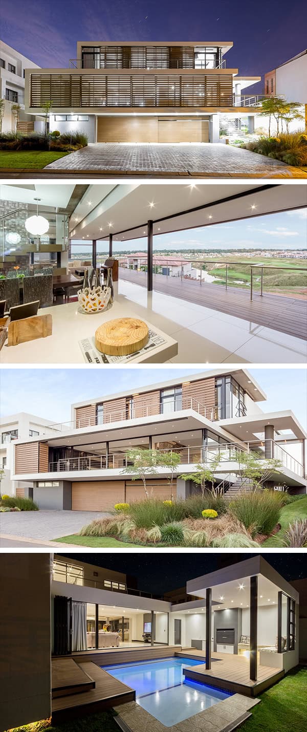 From the architects: “The contemporary home is located on a steep embankment within Ebotse Golf Estate, Gauteng. Both the site and the brief from the client called for a house design which included views of the surrounds. Gottsmann Architects utilized the steepness of the site to design a contemporary home that has primary views towards the lake and the golf course below. These wide panoramic views inspired the project name, House Vista. Glass and concrete were the main building materials used, while timber elements created texture and warmth in the design. The use of concrete as building material allowed for deep cantilevering overhangs as well as open planes. This ultimately generated a design which was perceived to be floating on its various levels. Cantilevering concrete slabs layered lightly above one another reveal changing views with each level of the residence. The Large glass sliding doors open up to expansive vistas while the metamorphosing quality of the sliding screens provide various degrees of privacy for the client. The house ultimately transforms between the extroverted and introverted, adapting to the mood of the inhabitant.”