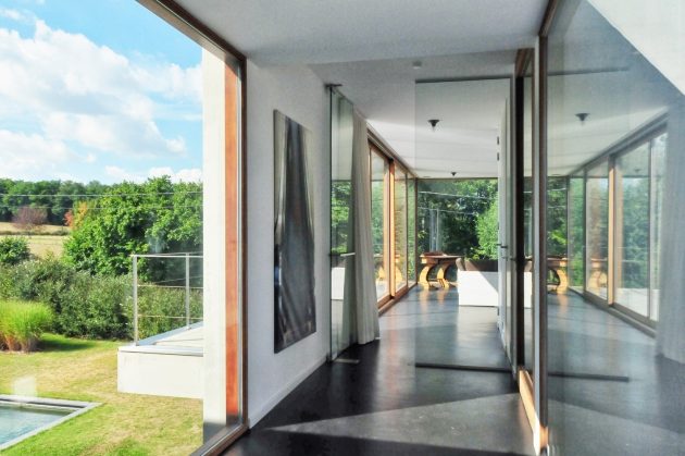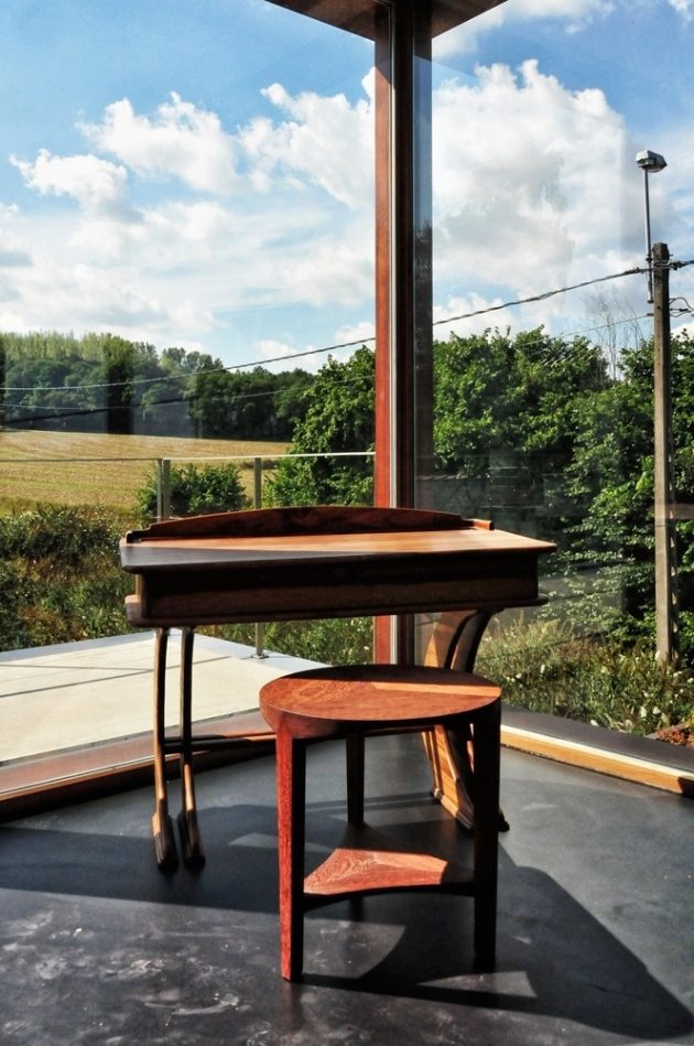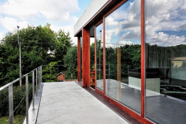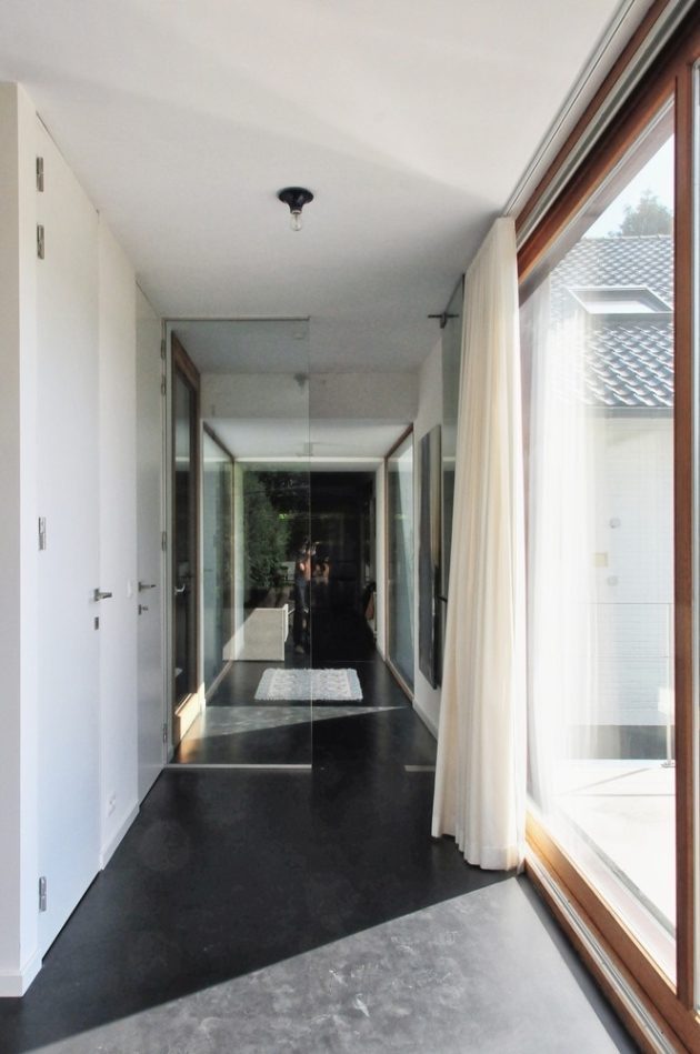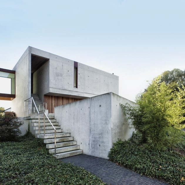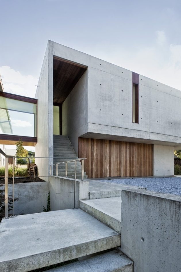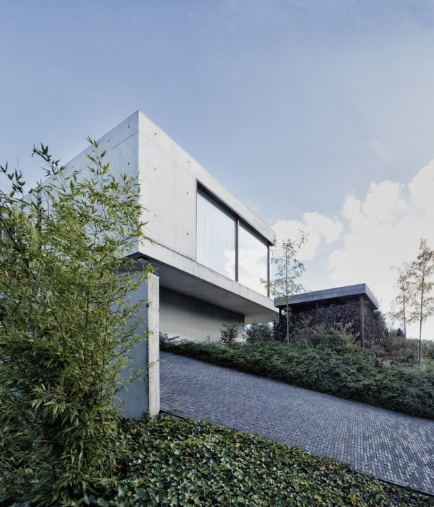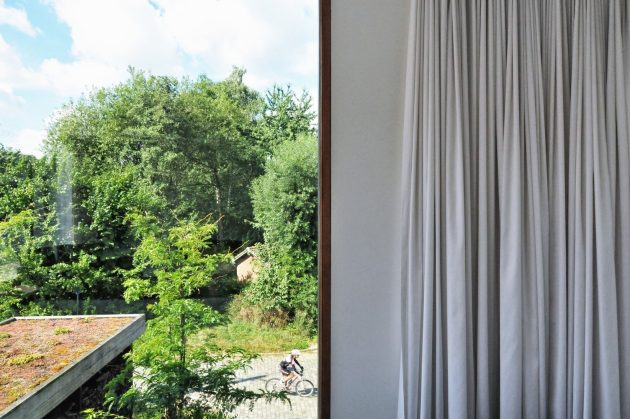 House WIVA is an extension project by OYO in Herent, Belgium. The goal of the project was to create a flexible living space that could be transformed into a separate unit with its own bedroom and bathroom. OYO achieved this by emphasizing the contrast between the old post office building and the new concrete extension that seems to float above the garden.